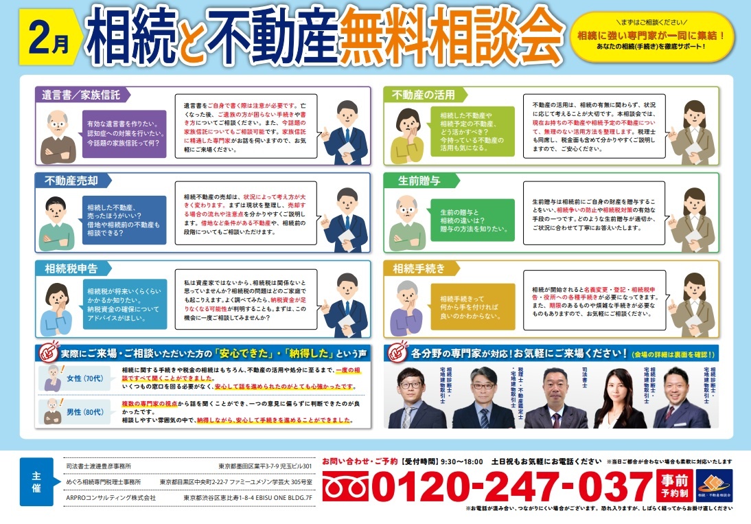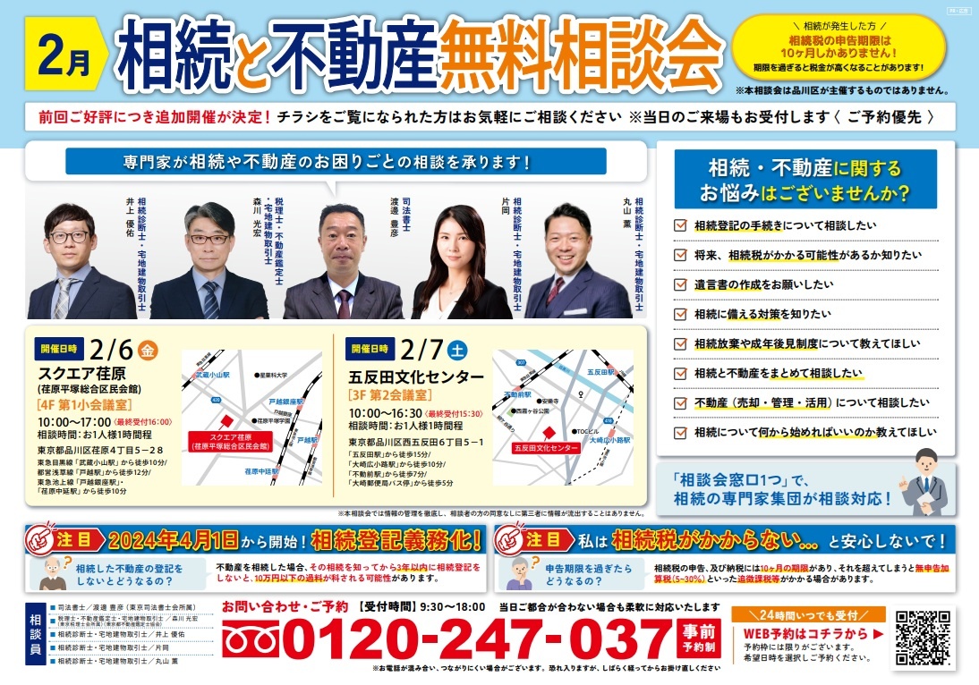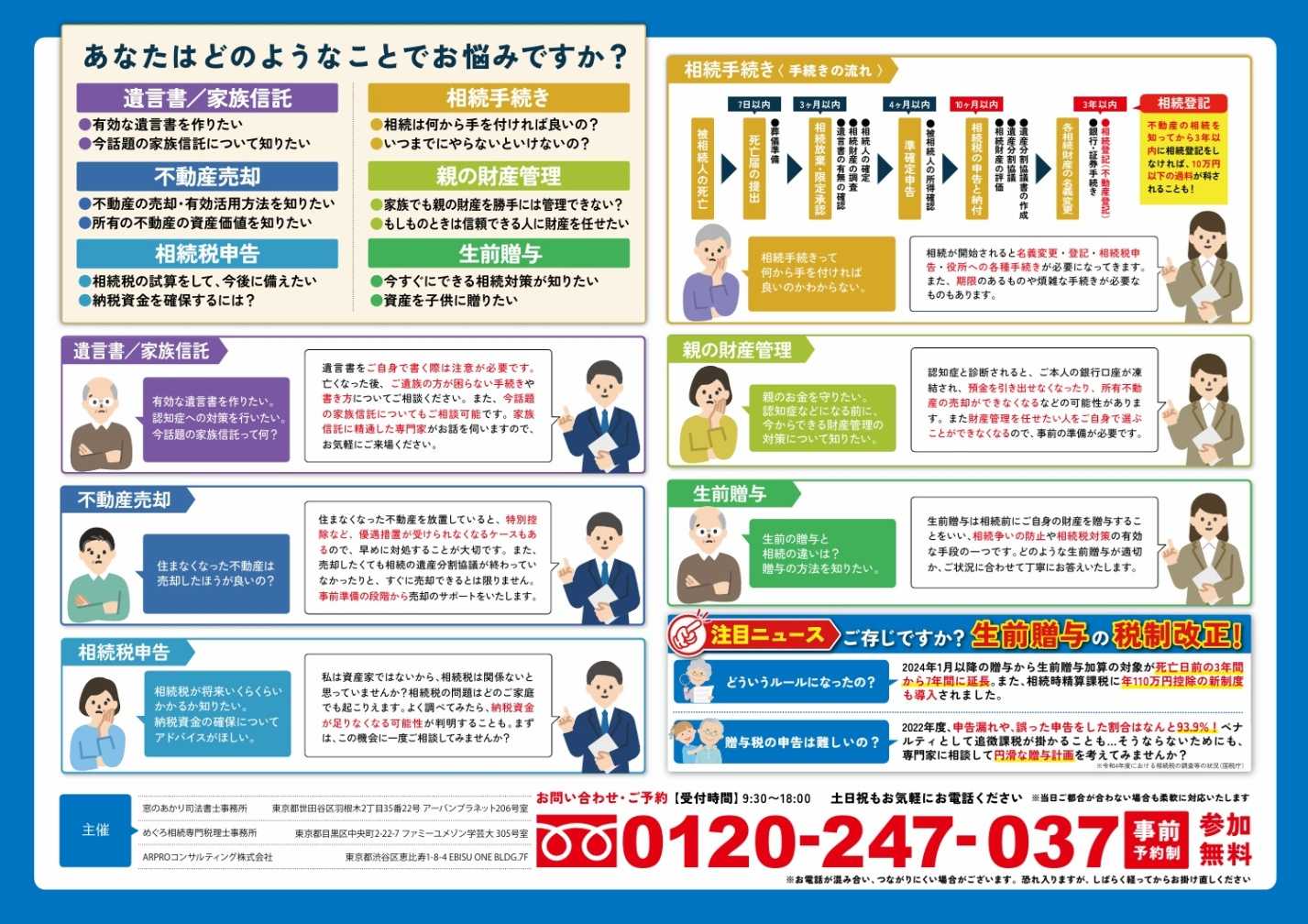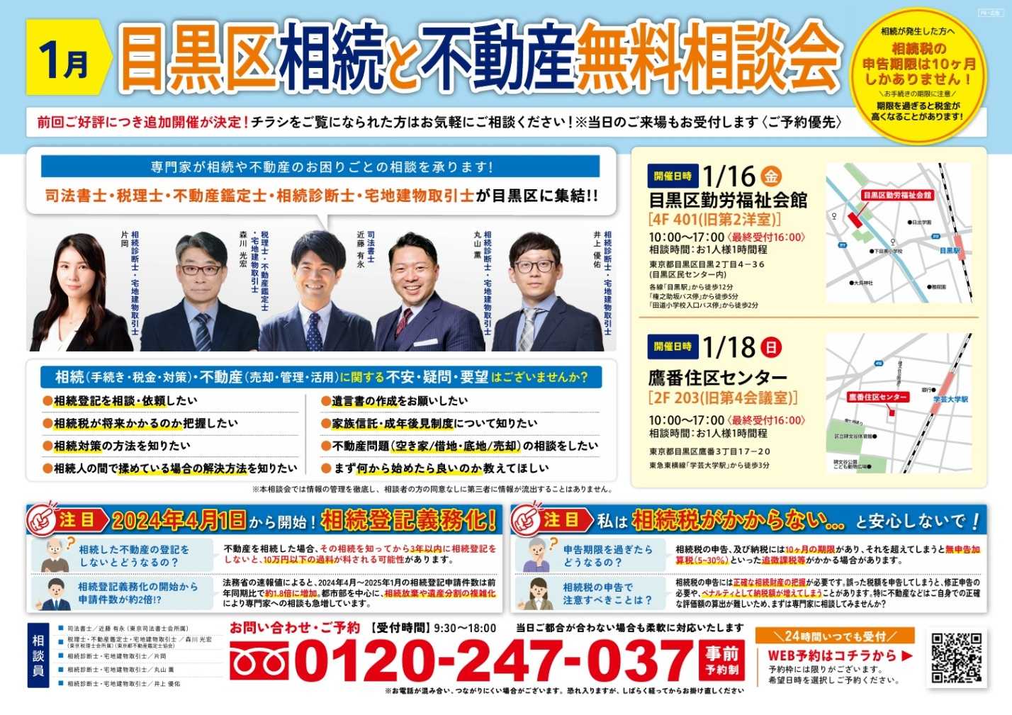 ご好評につき、今回は目黒区にて追加開催いたします! チラシ(裏面)に記載の通り、相続登記の義務化や相続税の申告期限など、知っておかないと不利益を被るルールも増えています。
